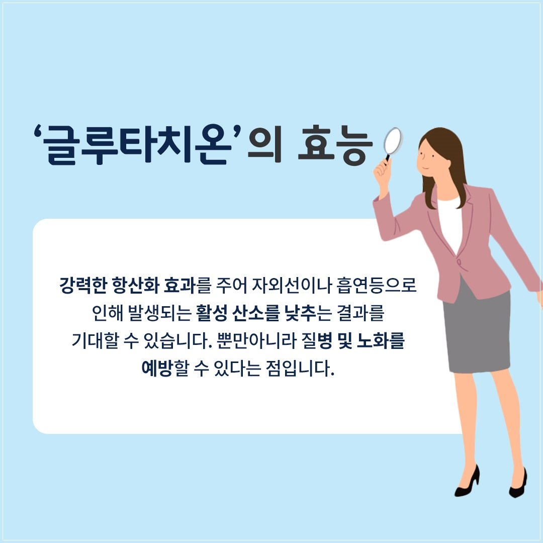 글루타치온은 피부를 구성하는 각질층을 보호하는데 효력을이고요니다. 각질층은 피부를 보호하는 역할을 하며, 좋은 피부를 유지하는데 중요한 역할을 하고요. 글루타치온은 각질층이 튼튼하게 유지되게끔 하도록보호해주며, 피부 건강을 보존하는데 큰 역할을 하더라고요.