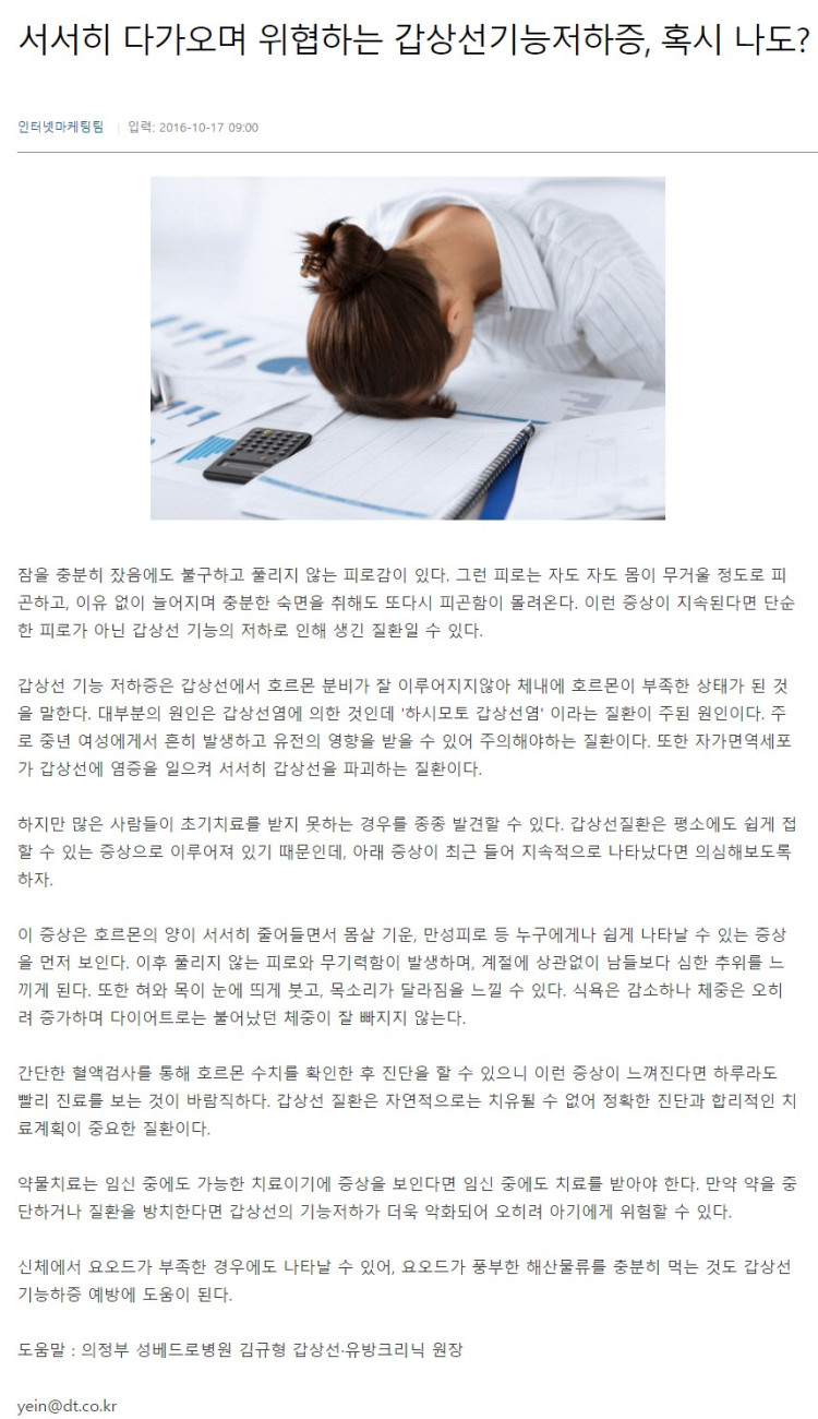 혹시 유독 남들보다 추위를 많이 느끼시나요? 그렇지 아니하면 요새들어서서 피로감이 심해지셨나요? 섭취한것에 비교해서 체중이 많이 늘어났나요? 이 세가지 물음에 모두 맞다라고 대답하신다면 피로누적이나 단순감기가 아닌 갑상선 기능 저하증일 수 있다던하고요.