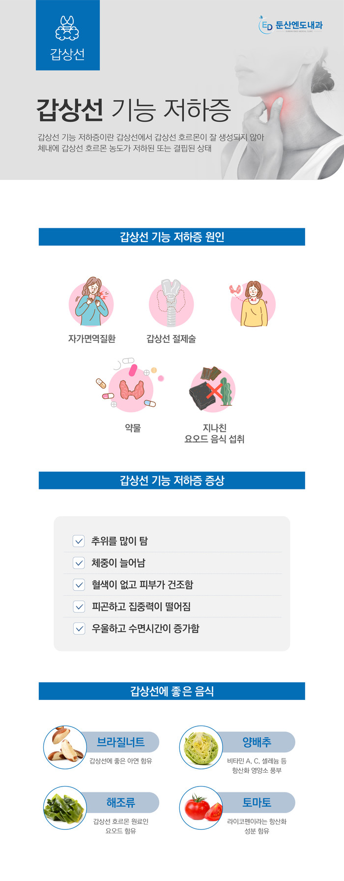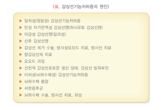 갑상선 기능 저하증 원인으로는 갖가지의 이유가 있습니다. 갑상선 호르몬을 생산이 줄어들어 생길수도 있고 갑상선수술이나 방사선 요오드 치료한 후에 자가 면역질환이나 선천적 갑상선 결함과 바이러스 감염, 종양, 감염, 암 전이등등의 까닭이 있을수 있다고 합니다. 갑상선 호르몬은 영유아기 때 정상적인 신체 성장에 무작정이고 호르몬을 생성하여 인체의 대사 단계을 강화하는등의 모든 기관의 기능을 유지하는 역할을 하고 있으므로 갑상선에 문제가 생기면 피로, 체온제어 이상 과 같은 여러 증상으로 발생할수 가있다고 합니다.