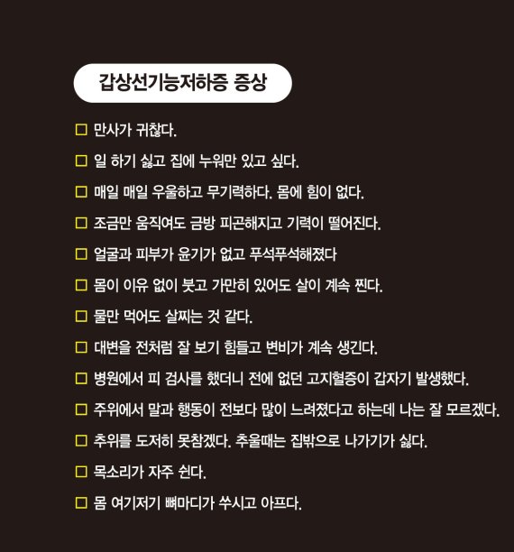 이것은 갑상선 기능 저하증 증상을 가진 분들이라면 다 동조하실 것 같은데요. 계단을 조금만 오르내리거나 경사진 곳을 다니면 일반인들에 비교했을 때 금방 지치게 되고 숨이 차서 힘들어하더라고요.